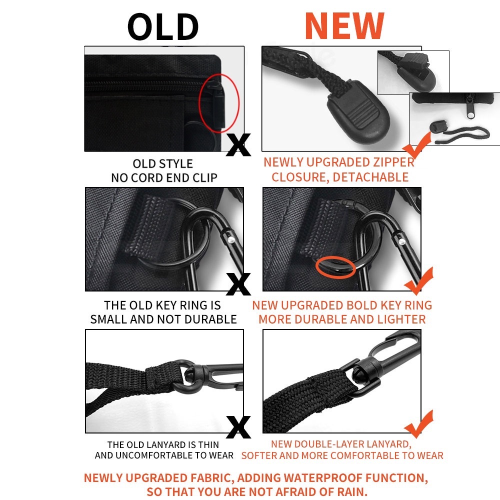 Comes with free carabiner and lanyard. Quality fits its price, great as my market wallet. Coins cards and notes can fit easily. Fast delivery too.