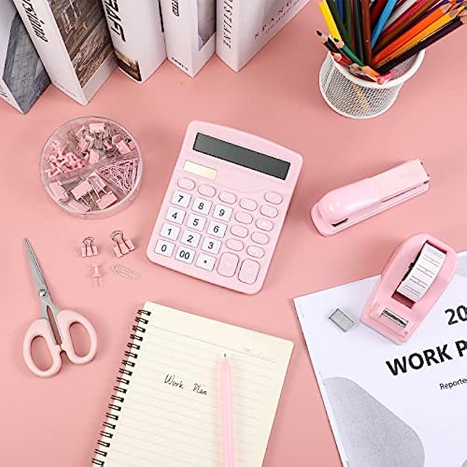 6 Set Desk Accessory Kit Office Supplies Include Cute Stapler Tape Dispenser Ballpoint Pen Binder Clips Paper Clips Scissor and Calculator for Women Girls School Stationery (Pink)