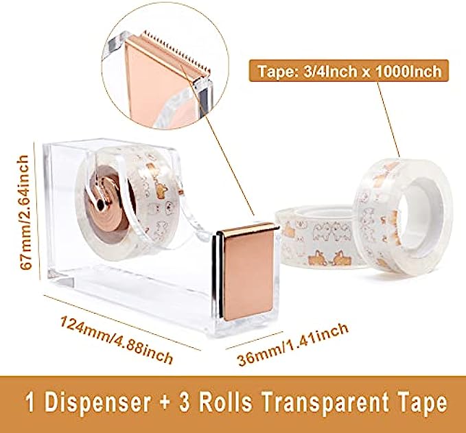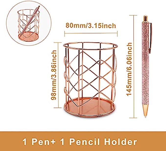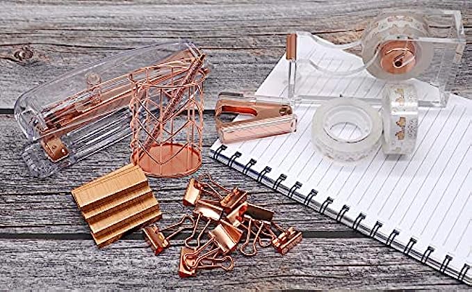 • 【Specification】 the gold stapler size:6.14 x 1.41x 2.56 inch; Tape dispenser size:4.88 x 1.41 x 2.64 inch; Staple Remover size is 2.36x 0.61x 1.57inch; Binder Clips szie is 0.75x 0.35inch; Pencil Holder size is 3.15x 3.86inch, all rose gold rose gold tape dispenser and stapler are regular size for office desk use.