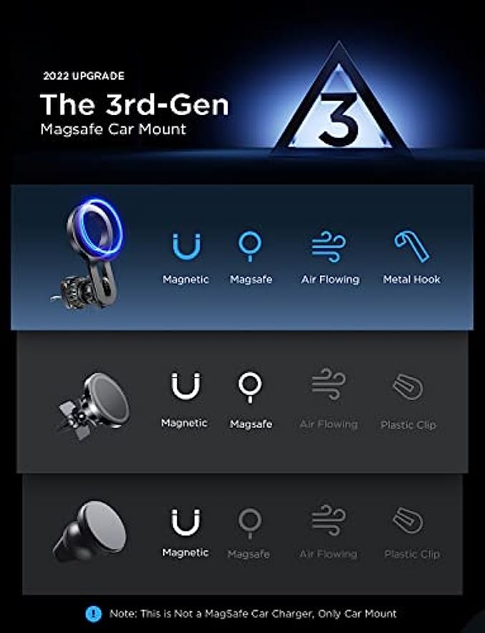 • ?More Stable, Less Blocking: LISEN brand laboratory has upgraded this magsafe car vent mount from 3 directions.①Upgrade extension arm to protect your phone overheating crash; ②Cell phone holder for car mount with most stable "Steel Hook";③Magnetic phone car mount that has the strongest magnet force, which can hold up to 10 iPhone 13 Pro Max. LISEN provides at least 1 years of user service.