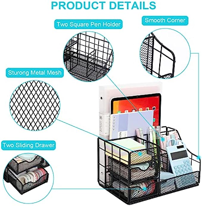 • 【Space saving modern design】Mesh design allows you to easily find anything you need. Our desktop organizer has unique 2 sliding drawers, Perfect for storing your office gadgets such as sticky notes, rulers, business cards, small tapes,small clips, etc. Let you stay away from messy desktop and keep organized.