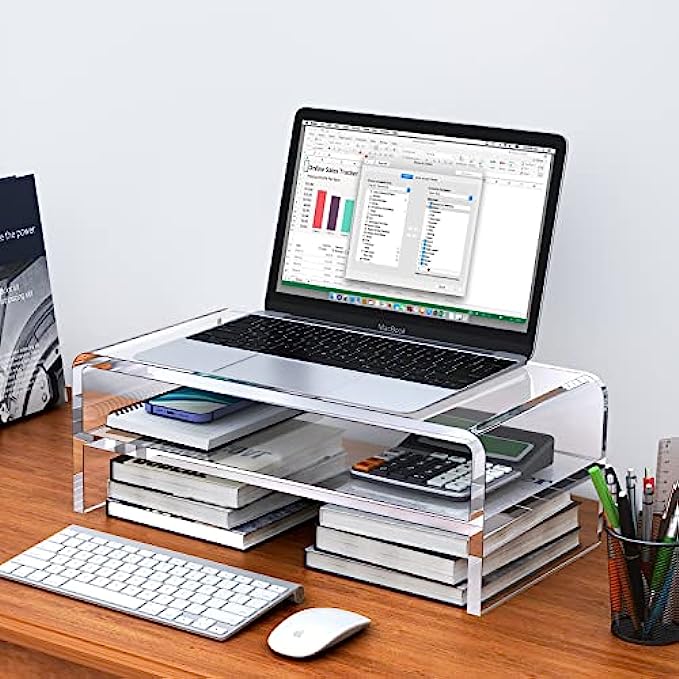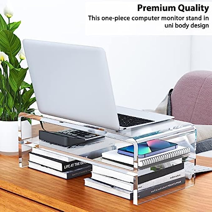 • 【MULTIFUNCTIONAL ACRYLIC STAND】The clear acrylic stand can not only place a computer monitor or laptop on the desktop, its strength and aesthetics can also be used for a variety of storage, such as organizing set-top boxes and remote controls under the TV; organizing files in the office ; organize books in the dormitory.