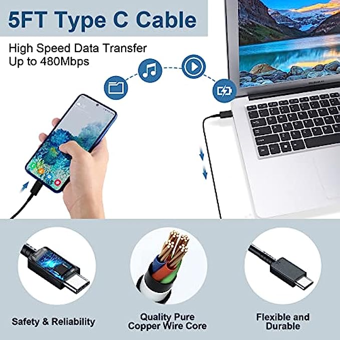 • 5FT Type C Charger Fast Charging Cable: USB-C connector offers a user-friendly reversible design, fast Charging and transferring, Up to 480 Mbps data transfer speed; power output up to 3Amp