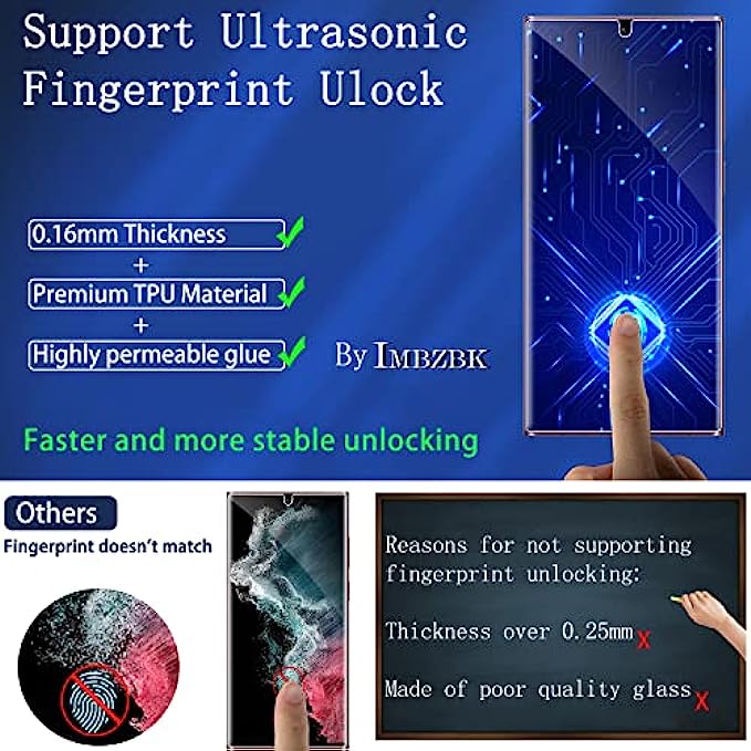• [Flexible Materials & Bubble Free] Please Note: The screen protector is not tempered glass, it is made of premium thermoplastic polyurethane (TPU), a flexible material that can covers the curved edges of the Samsung S22 Ultra, provide maximum protection against scratches. With nano-elastic to prevent screen breakage caused by drops. Small scratches and air bubbles can be repaired automatically within 24 hours because of the use of a High-permeability glue with strong adhesion.