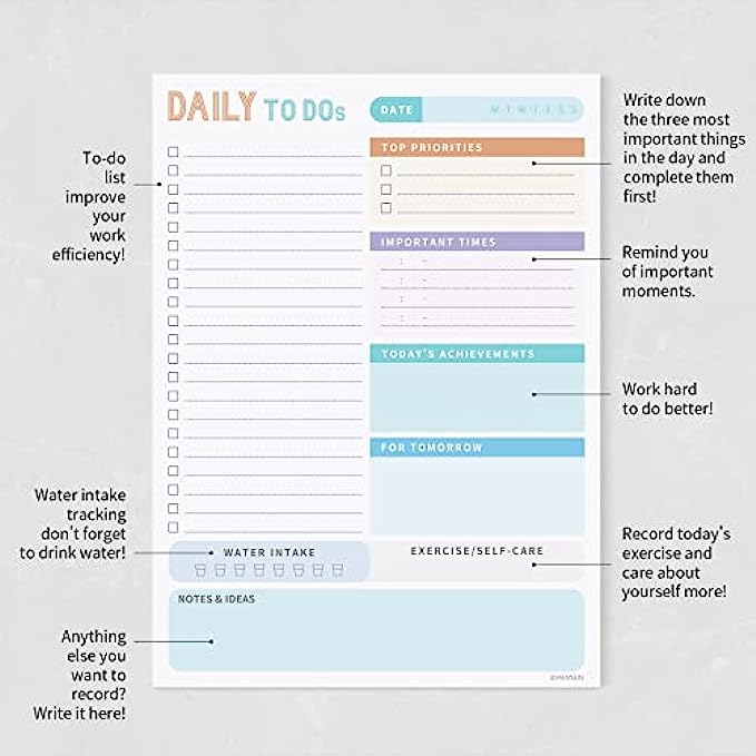 Multifunctional To Do Notepad - After finishing today's daily work, you can also write down the things to do left for tomorrow. There is a section to remind you to drink eight glasses of water, and pay attention to your health during busy work. In addition, you can also record your exercise and ideas of the day.
