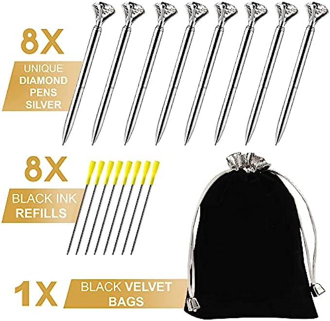 • ? What’s in this awesome set? The luxury pack contains 8 Silvery pens topped with large diamonds and black ink inside, made of high-quality metal. Next to them, you get 8 extra 3.23-inch black ink refills, with NIB SEAL WAX to prevent any ink flow problems like spilling or drying out. To ADD MORE VALUE, these accessories come together in a delicate black velvet bag with silvery rope. With this premium set, any girl or women will feel amazing, just like a princess!