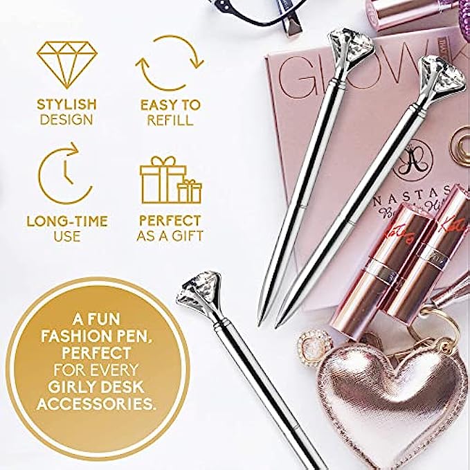 • ? How can I use them? Comfortable and simple to use, with just a twist action to open or close, the pretty pens with fine point and precious stone on top offer smooth and beautiful handwriting. The jeweled refillable bulk pens are perfect for guest book, journal, novelty, business, conference, school, teachers, graduation, anniversary, birthday, wedding planner and photoshoots. Fun Christmas gifts, these bling pens for women are durable and reliable writing instruments that won’t let you down.