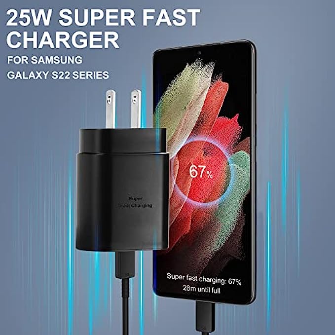 25W Samsung Super Fast Charger: Equipped with an USB Type C port, the Power Delivery 3.0 USB C wall charger provides you Max 25W output power. You can charge your deivce back to full power in no time by using the 25W USB C charger for Samsung galaxy S22, S22 Ultra, S22+, S22 Plus, z fold3 5G, z flip 3, S21, S21 Ultra, S21 Plus, Note 10 and more. You can charge your Phone to 60% in just half an hour, 5 times as fast as standard USB C wall charger. 10FT C Charger Cable Fast Charging: The 25W super fast type c charger is equipped with extra longer 10FT Type C to C cable, offering a user-friendly reversible design and longer charging distance, fast charging and up to 480 Mbps data transfer speed. The power output up to 3 Amp and 100-240 volt input of this 2pack Samsung super fast chargers can charge two devices simultaneously, ideal for worldwide travel with your partner! Super Fast Charger Universal Compatibility: The Samsung S22 Ultra fast charger kit supports most of USB C devices, including Samsung Galaxy S21/ S21+/ S21 Ultra 5G/ S22/S22+/S22 Ultra/Note10/ 10+, Note 20/20 Ultra 5G, S20/S20+/S20 Ultra 5G/ S20 FE(Fan Edition) 5G, S10, S10+, Galaxy Z fold 3/ Galaxy Z Flip 3,S10e, S9, S9+ Plus, S8, S8+ Plus/Active, Google Pixel, Pixel 2, Pixel 3, Pixel XL, Pixel 2XL, Pixel 3XL, Pixel 3A, LG G7 Thing, G6, G5, V20, V30, V35, V30S, V40 ThinQ Plus, etc. Safety Assurance: The Samsung galaxy S22 super fast charger is built in intelligent chips, which can protect your devices against damage caused by short circuit, over-current, over-voltage, over-heating, and over-charging issues. Automatically stops charging when battery capacity is full to ensure your device safety and longevity. What You Get: 2-PACK 25W super fast chargers and 2-PACK 10FT Type C to C cables. 24*7 friendly customer support ensures your pleasing shopping experience. If there is any problem, please do not hesitate to contact us!