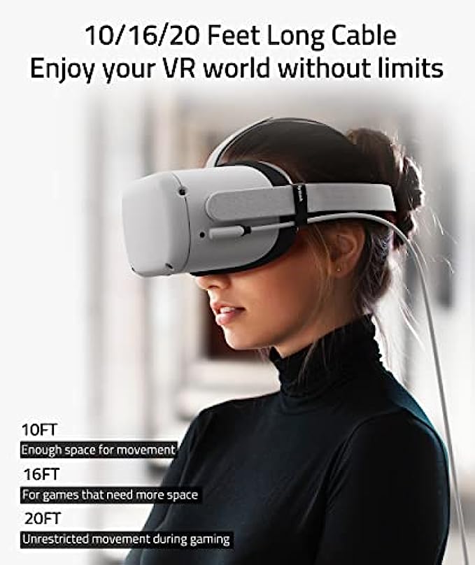 • Flexible and Comfortable: This 16 ft long cable gives you maximum freedom of movement without being restricted while immersed in the VR world. At the same time, considering the users' experience, the regular USB C port is especially changed to L Shaped design to enhance customers’ comfort.