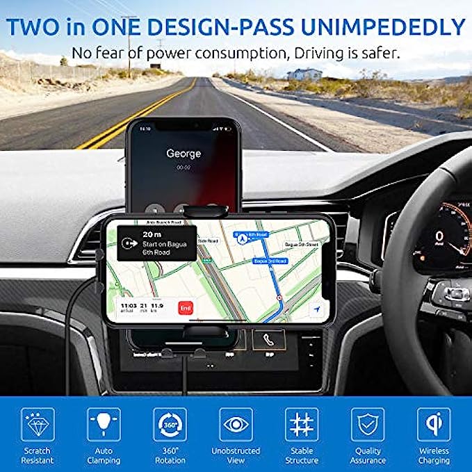 • 【2-IN-1 Design】 Combines the Qi Wireless Charger and a car cell phone holder, allows for a secure hands-free experience. Keep you away from the tangled locating cords or cables. Cell phone holder is suitable for car Windshield Dashboard Air Vent installation, and makes GPS and phone call more convenient