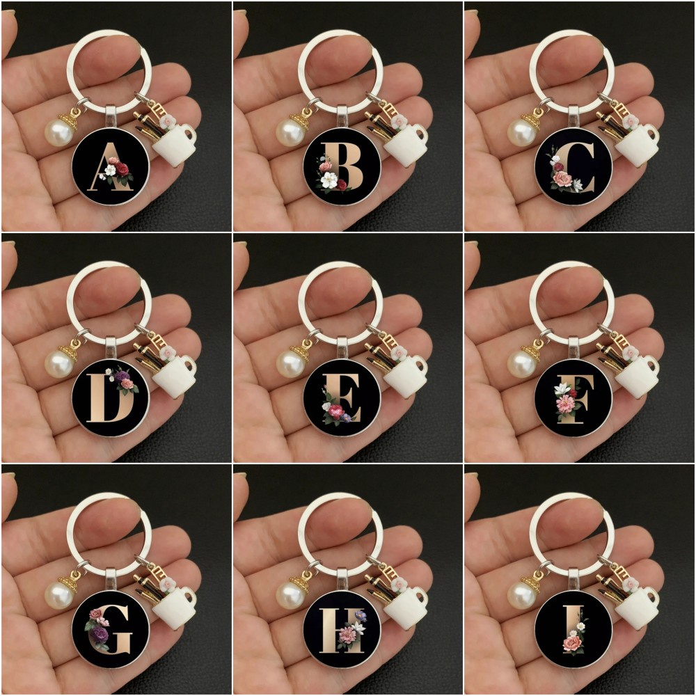 Fashion Charm Enamel Pen Holder for Teacher's Day Gifts Elegant Pearl A-Z Letter Pattern Glass Cabochon Key Ring
