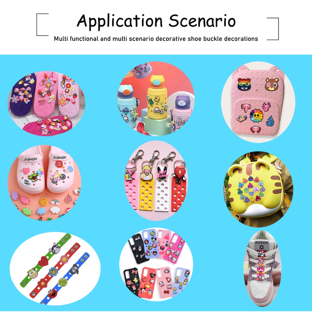 Material Quality:soft Colour:bright colors Fast response delivery beautiful cartoon characters fit well my croc shoes thank you.