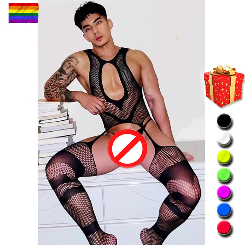 Men Bodysuit Hollow Bar Club Dance Party Transparent Black sissy Underwear Male Sleepwear Body Stockings lingerie for gay